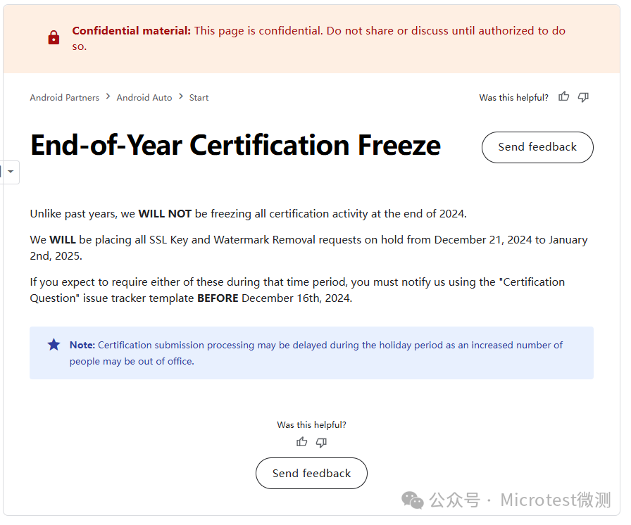 隨著圣誕節的臨近,一年一次的谷歌AndroidAuto認證冷凍期公告消息放出!與往年不一樣的是,在今年年底谷歌的 Android Auto 認證流程將不再暫停,但是 2024年12 月 21 日至 2025 年 1 月 2 日期間所有 SSL 密鑰和水印去除請求將暫時擱置。