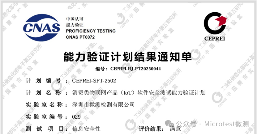 國(guó)家級(jí)能力驗(yàn)證認(rèn)可: 在工業(yè)和信息化部電子第五研究所(中國(guó)賽寶實(shí)驗(yàn)室)組織的“消費(fèi)類(lèi)物聯(lián)網(wǎng)產(chǎn)品(IoT)軟件安全測(cè)試”能力驗(yàn)證計(jì)劃中,Microtest微測(cè)檢測(cè)表現(xiàn)優(yōu)異,獲得“能力驗(yàn)證結(jié)果滿(mǎn)意通知書(shū)”。這進(jìn)一步印證了其網(wǎng)絡(luò)安全技術(shù)實(shí)力在國(guó)內(nèi)頂尖權(quán)威機(jī)構(gòu)層面的充分肯定。