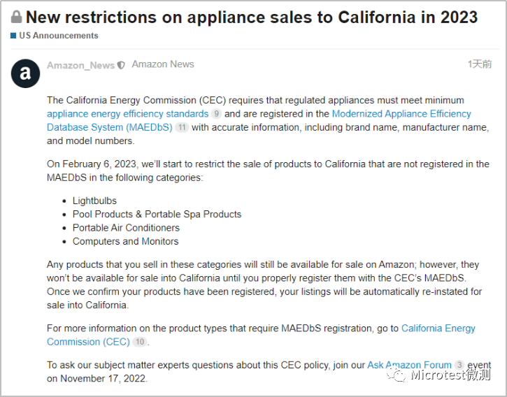 以上必須滿足CEC Title20電器能效標準要求,并在CEC能效數據庫系統(MAEDbS)中注冊列名,注冊信息包括品牌名稱、制造商名稱和型號等。也就是說以上品類必須滿足CEC Title 20 能效認證,并在CEC 能效數據庫系統(MAEDbS)中注冊。如無CEC MAEDbS注冊的將無法在加州銷售,一旦賣家完成MAEDbS注冊將自動恢復銷售。