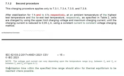 1、更新后的標(biāo)準(zhǔn)修正了7.1.2 章節(jié)中關(guān)于電芯恒溫充電的擱置時間,將擱置時間由1h and 4h respectively 修正為1h to 4h,充電方式由恒壓修正為先恒流充電再恒壓充電。