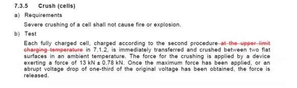 2、7.3.5章節(jié)擠壓測試,更新后的標(biāo)準(zhǔn)刪除了原標(biāo)準(zhǔn)中上限充電溫度的描述, 新標(biāo)準(zhǔn)明確了上、下限充電溫度都需要測試。