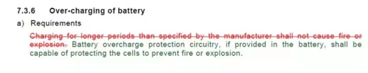 3、7.3.6章節(jié)過充測試,修正測試要求的描述為:如果電池中帶有充電保護電路,應(yīng)該能夠保護電芯防止起火或爆炸。