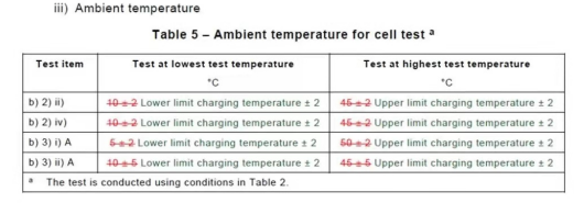 1. 4、7.3.9章節(jié)強制內(nèi)部短路測試,修正了測試溫度的描述,由原來的10℃/45℃修改為按照制造商宣稱的充電溫度下限/上限來處理。